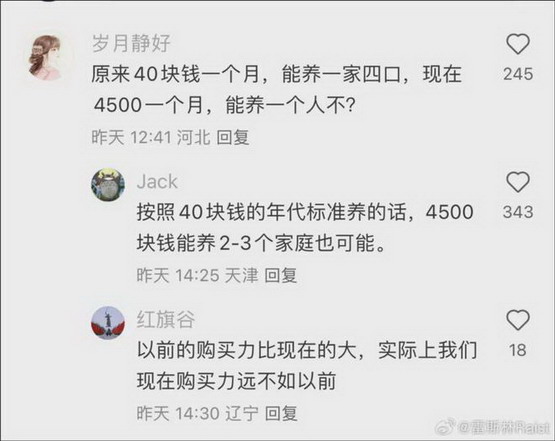 理由是:以前一个月赚.40.块,就能养活一家四口;现在.4500.元一个月,养不起一个人。
