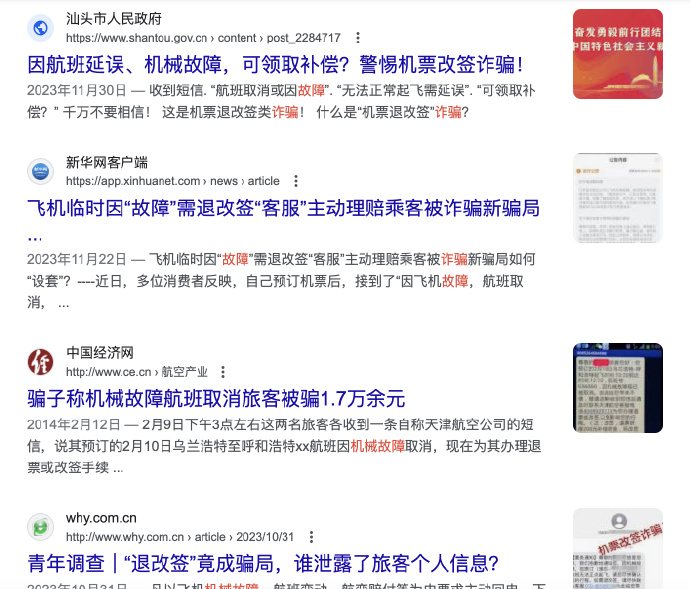 晚上接到一个自称航司工作人员的电话,说我明天飞深圳的机票因为 “机械故障” 取消了,协助我改签到半小时后的一班。我问新航班班次是啥?答曰备选航班不对外发售,所以暂时显示不了班次;我问为什么携程上没通知?答曰因为是临时发生的,情况紧急,携程还没来及更新。