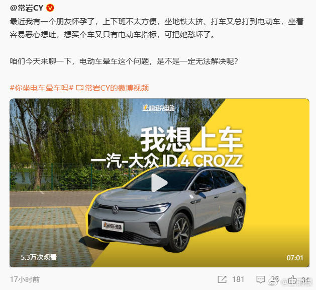 @王铜根:昨天 @常岩 CY 这个关于电动车是不是一定要晕车的视频,转发字数不够,单开一帖说。现在关于电动车晕车的问题,网上很少有人说对,大部分人的认识都是错的。本博今次一次说明白:
