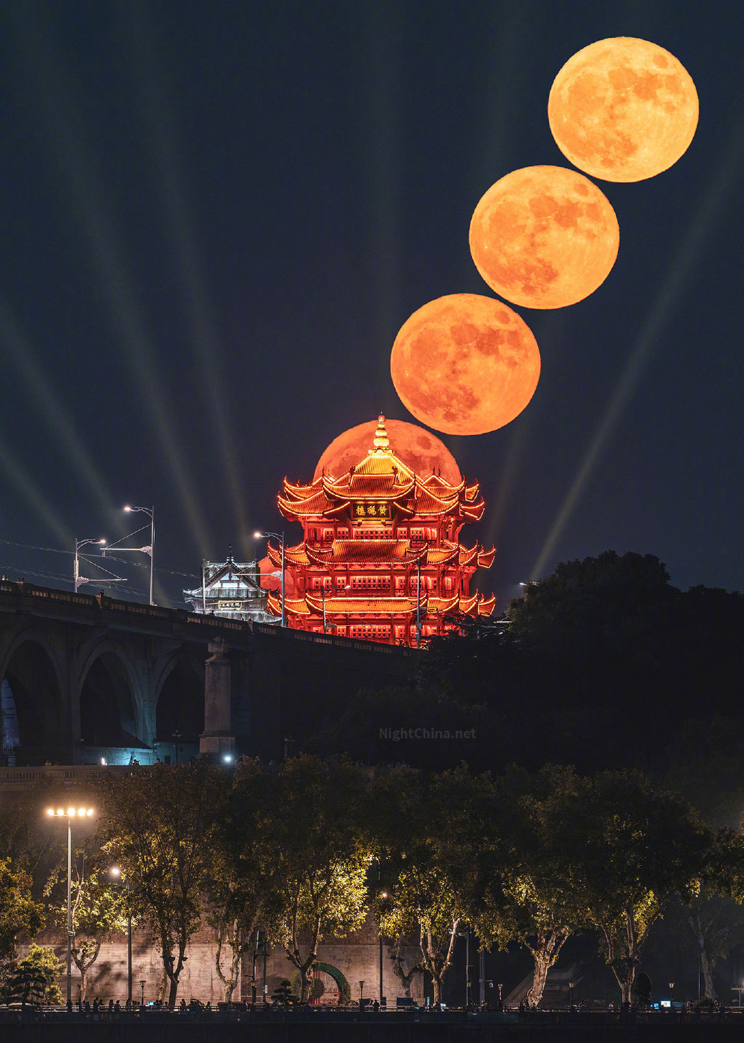 一轮硕大的满月缓缓升起,与黄鹤楼的景观灯光相互辉映,构成了一幅独特的画面,使夜幕显得更加庄重古朴。