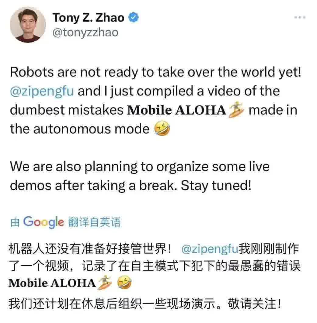 上周末的时候, Mobile ALOHA 的项目共同负责人 Tony Z.Zhao ,在 X 平台上发布了机器人的失败花絮,并澄清了外界对于机器人 “完全自动” 的误会。