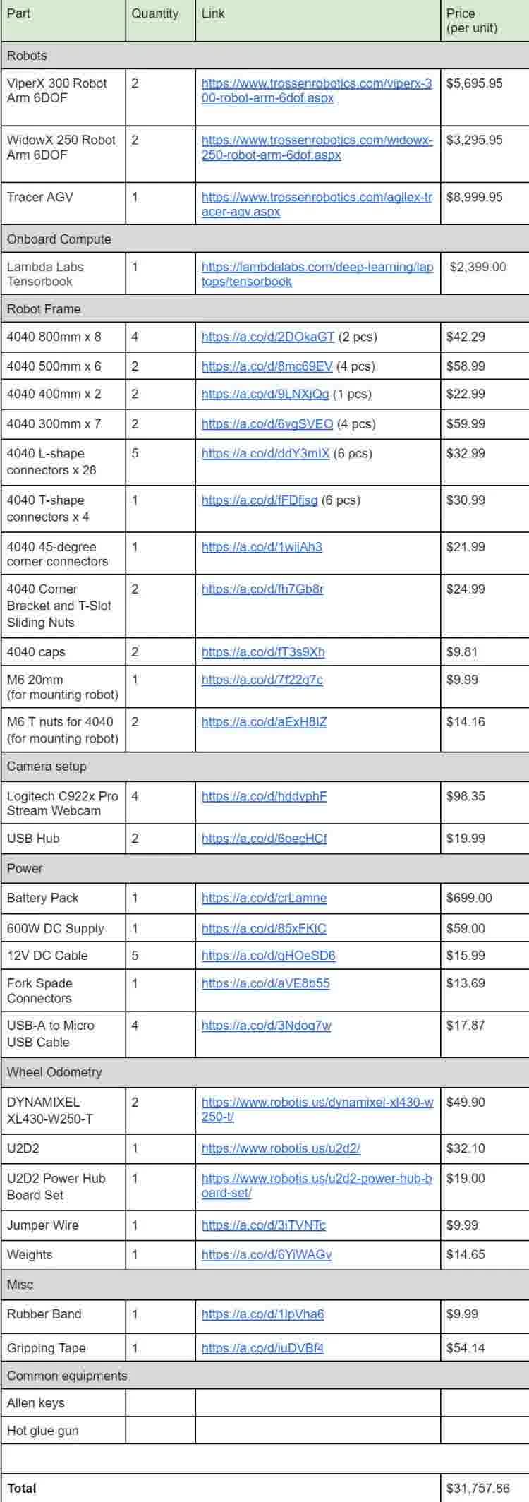 从团队公开的成本清单来看,费用主要也是集中在移动底盘和机械臂上,其他零部件的成本并不算高。
