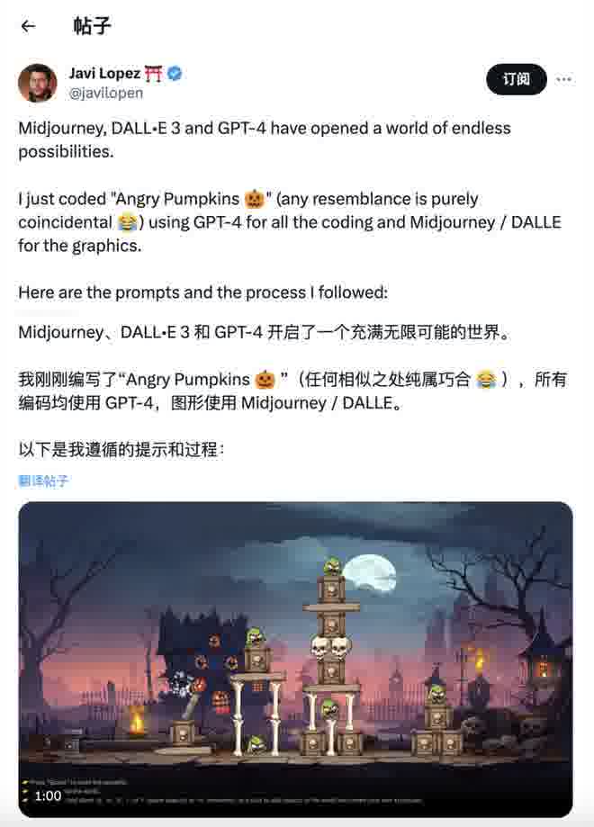 还记得之前万圣节的时候,有一个用 AI 徒手搓出来的 AI 版《愤怒的小鸟》吗,就是这哥们手搓出来的。
