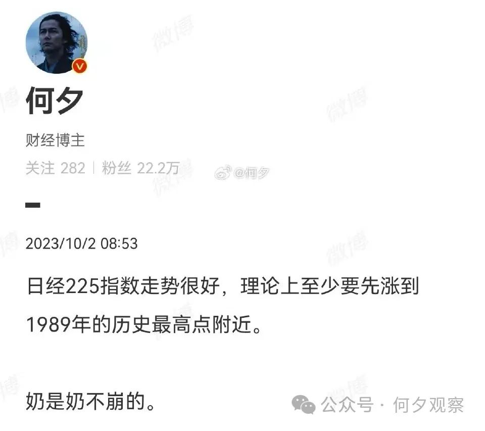 如下图所示,我在去年 10 月就讲过,“日经 225 指数走势很好,理论上至少要先涨到 1989 年的历史最高点附近”。