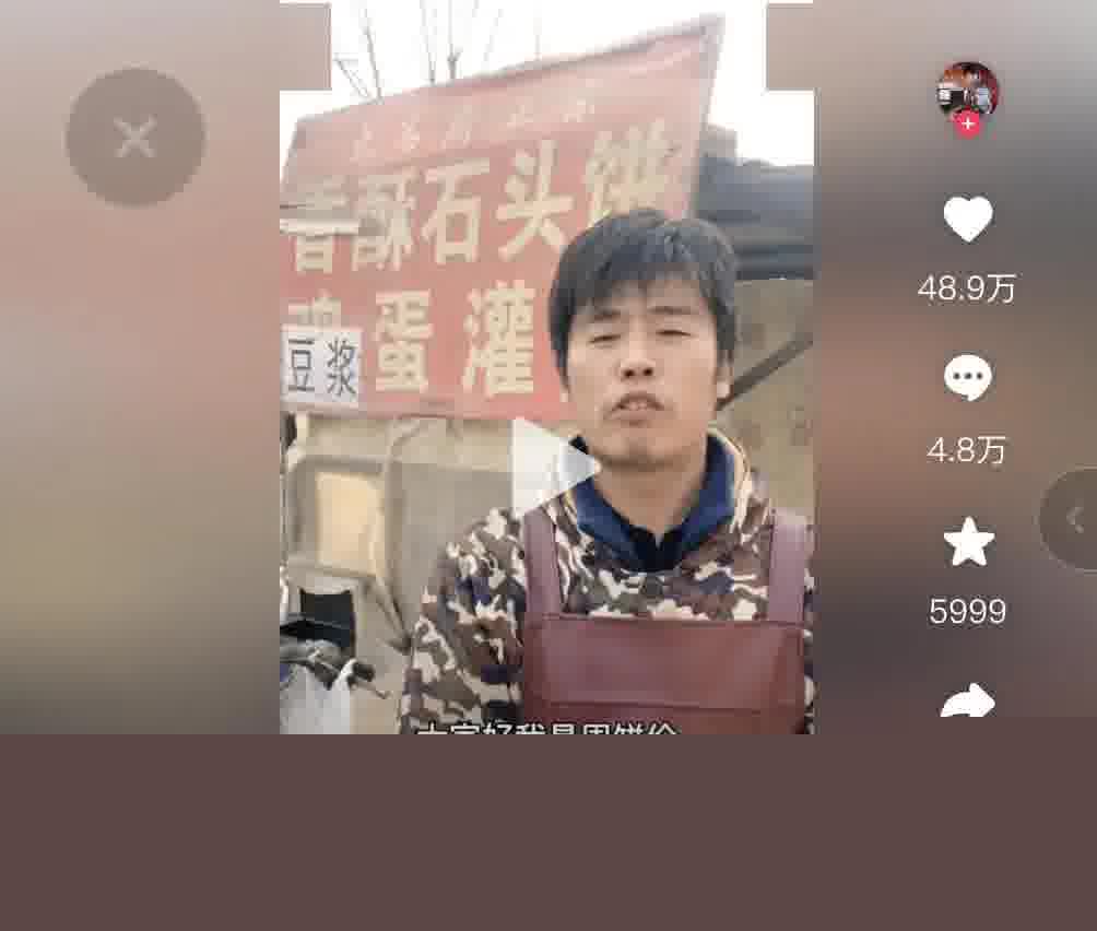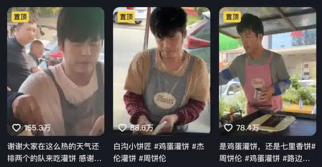 他第一次成名,是在 2020 年,当时一位顾客拍摄他做鸡蛋灌饼的过程,并配了周杰伦音乐发布在网上,很快就出现了一波热度。