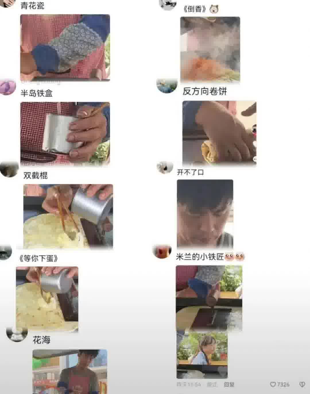 后来网友做了一个总结,说粥饼伦穿着的蓝白色套袖是 “青花瓷套袖” ,撑开灌饼的筷子成了 “ 双截棍 ” ,打散鸡蛋用的铁盒叫 “ 拌捣铁盒 ” ,往土豆丝上倒的各类调料叫 “ 倒香 ” ,还有给鸡蛋灌饼加的各类配菜,也被称作是 “ 不能说的秘密 ” 。。。