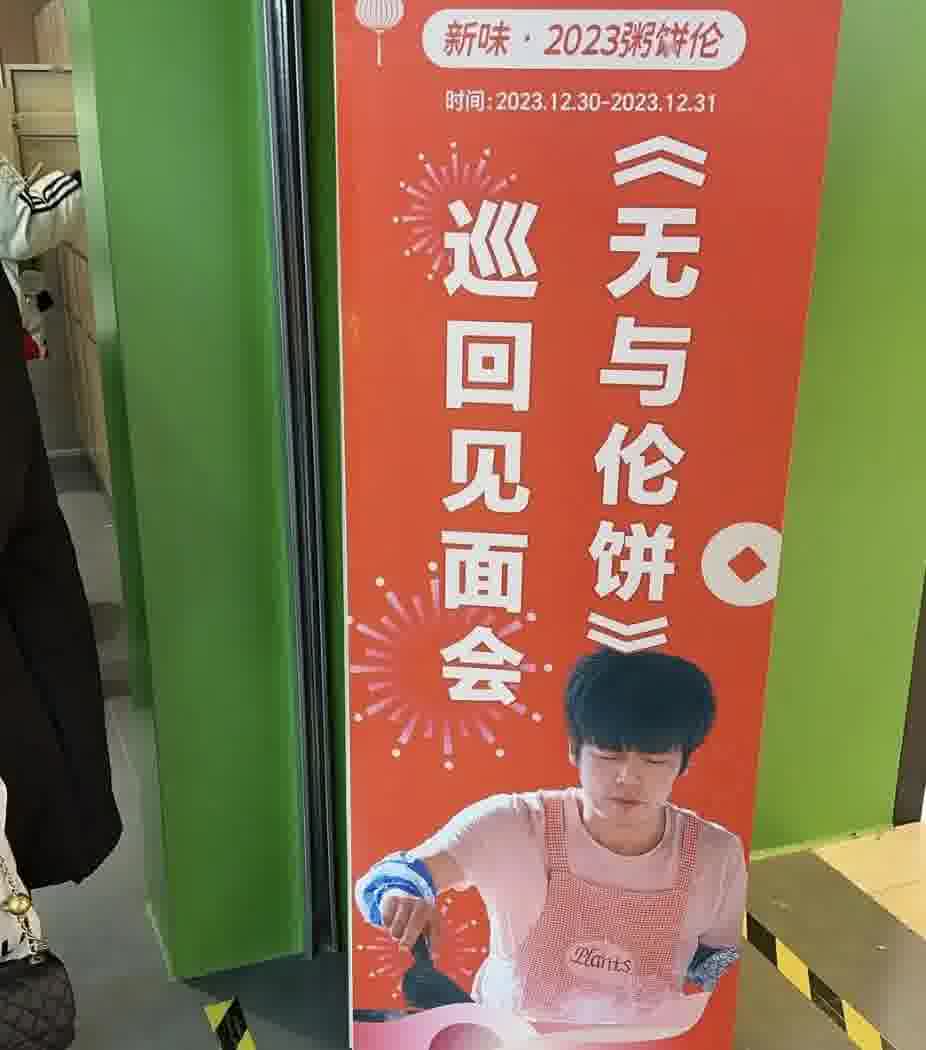 “粥饼伦” 的名字被贴到了地面的指向标上,有他照片的易拉宝也在活动现场立了起来。