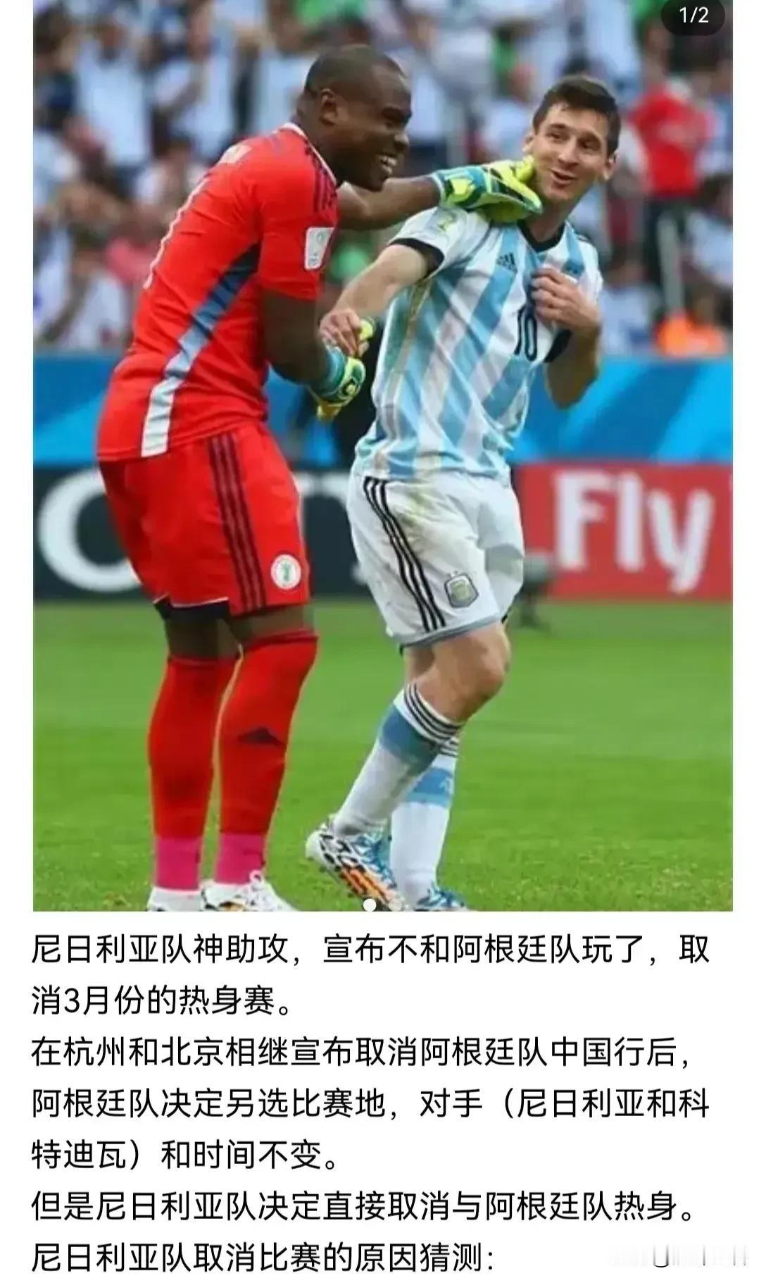 就在阿根廷认为自己很“聪明”时,他们的热身赛对手尼日利亚却发出声明,取消和阿根廷的热身赛,这下该轮到阿根廷在风中“凌乱”了,而据一些外媒给出的分析是,他们担心梅西事件可能会给他们带来不可预知的“风险”。