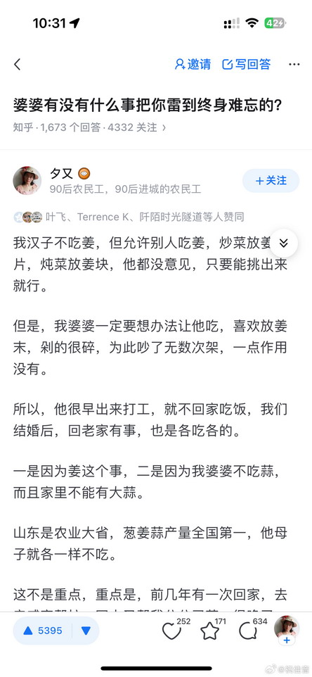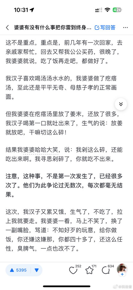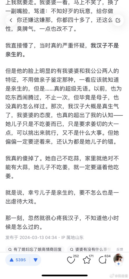@祝佳音: 知乎上有个帖子,是一个妻子写的。说自己老公不吃姜,但没什么过分的要求,就是在菜里看到姜会挑出来。但婆婆就看不得这个,千方百计逼儿子吃姜,你不是能把姜挑出来么,那就剁成丝,剁成末,剁成蓉,放到菜里。她老公每次在菜里吃到姜味,挑不出来,婆婆哈哈大笑,剁碎了你还能吃出来啊!儿子听了急火攻心,起身就要走,婆婆大伤心,你都这么大了还这么任性!辛辛苦苦给你做饭你还不领情!