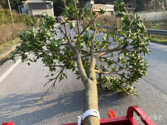 树被胡乱抡到山下马路边后,众人七手八脚把它一头装进美国叔叔的电驴小三轮里,叫我站在树根上压着一头,树冠就伸在外头马路上拖行。