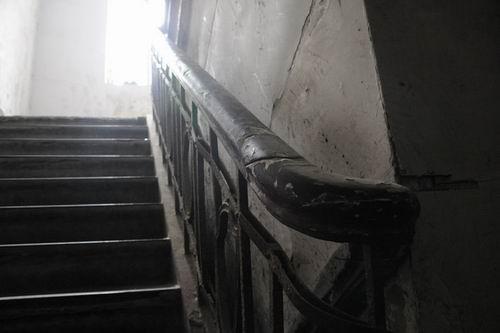 我跟在余老师背后上三楼。那楼道本来就窄,木台阶年久失修,凹凸不平,再加上陡斜,我攀着扶手上去都有点吃力,余老师的身体,更是摇摇欲坠。我一边提醒她要注意脚下,一边当心不要碰到那些挂在墙上的杂物和楼道灶台上的几只锅子。
