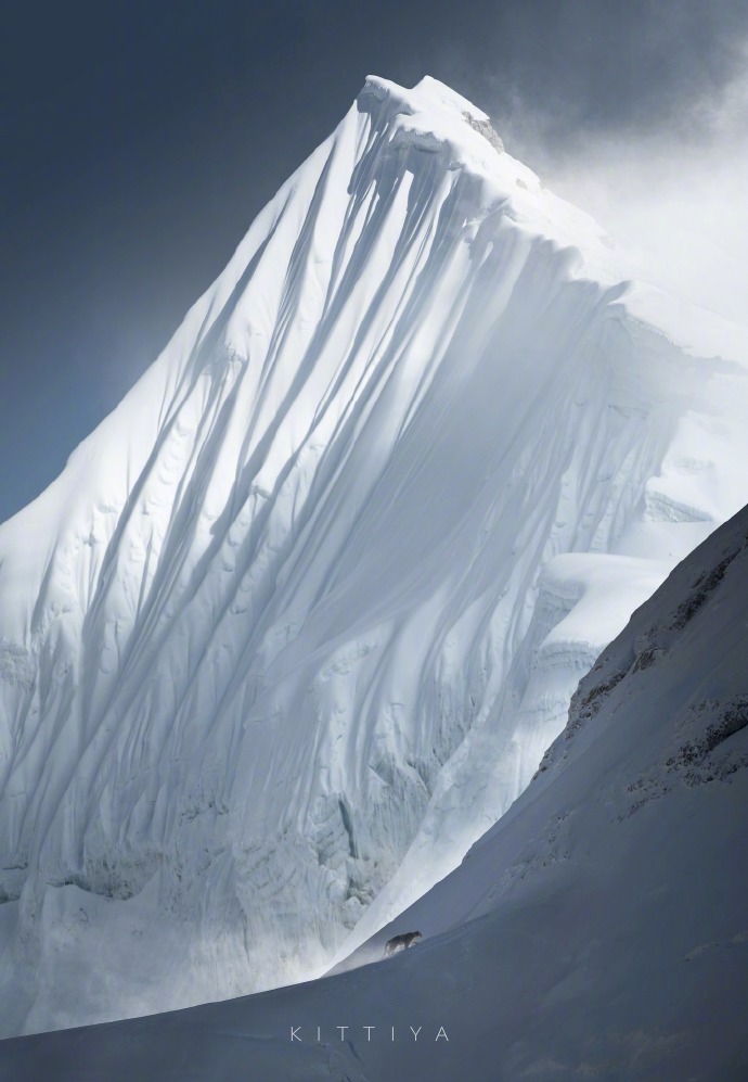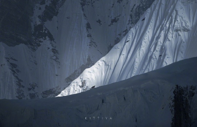 这套照片的震撼来自强烈的环境对比。大风吹起群山上的雪雾,缝隙里透过的光,冰糕上渺小的雪山隐士,简直浑然天成。