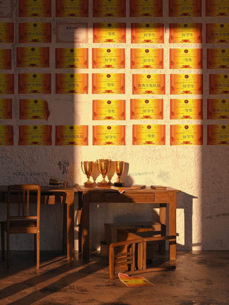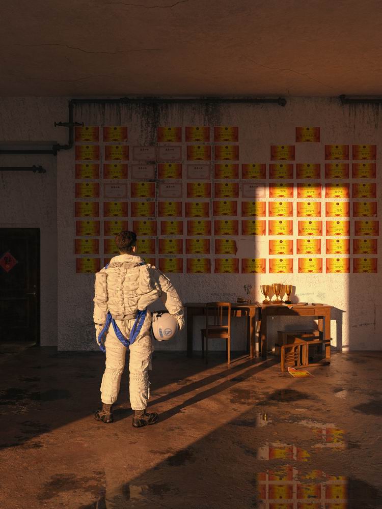 他为这幅作品写的说明是:“宇航员回到了自己长大的那间老宅,看到自己曾经为了追逐年少时的梦想而付出的一切。”