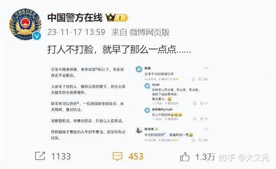 官方吐糟最为致命,中国警方在线官微也及时翻牌此贴,称:打人不打脸,早了一点点。