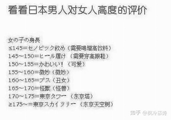 在日本媒体眼里,150-155cm是可爱的女生,而160-165cm身高的女生,日本人则直接认为这是丑女,至于身高超过165,甚至超过170的女生,那就变成了怪兽和东京塔。