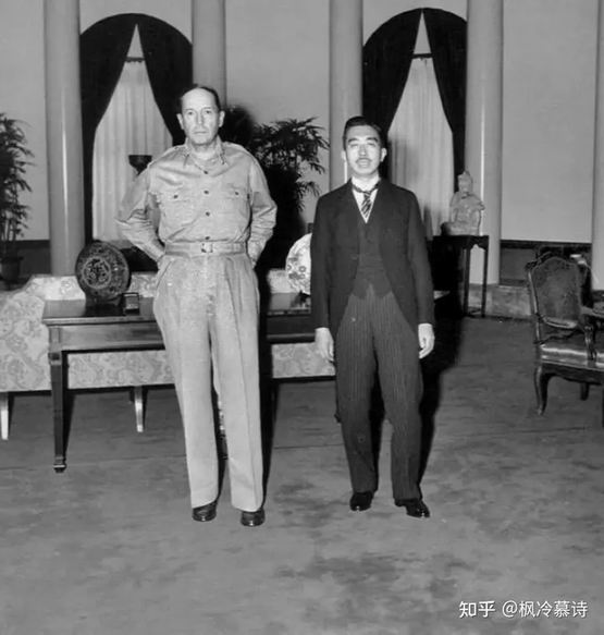 一夜之间,整个日本都知道了,原来神明般的天皇只是一个矮小瘦弱的普通人,与麦克阿瑟叉腰自信的样子相比,天皇甚至还有点呆板。