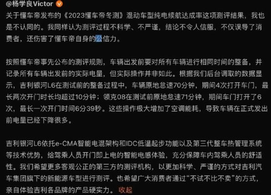 无独有偶,在大嘴怼完懂车帝之后,测试成绩里排名倒三倒四的吉利老总杨学良也发了一条长微博,里头的内容和问界发布的较为相似,同样也控诉了自己受测车辆在整备时受到的不公平待遇。