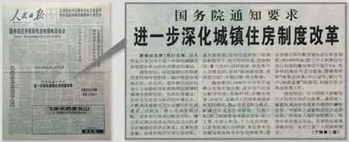 图为1998年7月22日《人民日报》刊发的报道。1998年7月3日,国务院颁发了《关于进一步深化城镇住房制度改革加快住房建设的通知》,正式开启了“取消福利分房,实现居民住宅货币化、私有化”为核心的住房制度改革——一场影响中国未来几十年的住房制度改革由此开始。