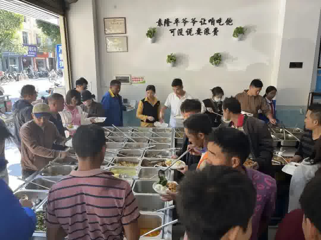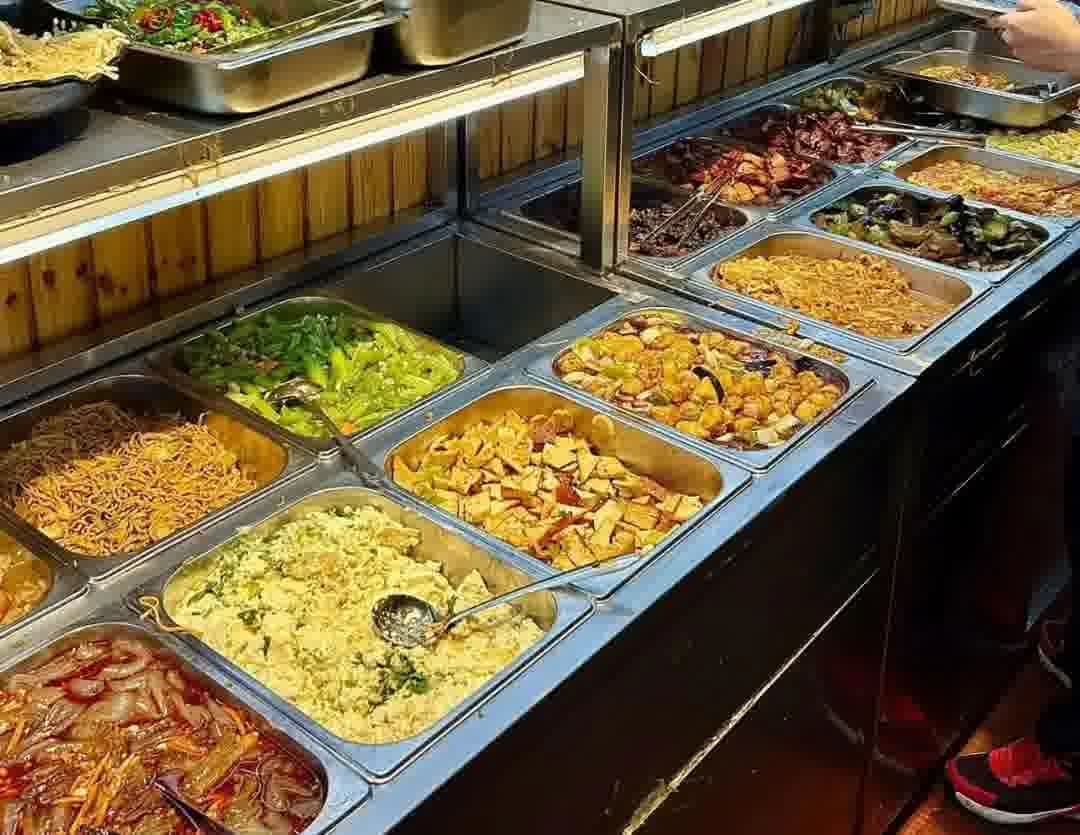 没有精致的滤镜,数十个不锈钢盆整齐排开,红烧肉、辣椒炒肉、猪肉炖粉条、韭菜炒鸡蛋,荤素不限量…… 配上无限供应的白米饭和三种自选汤,这顿有滋有味的自助盒饭,只要十来块就能管饱。