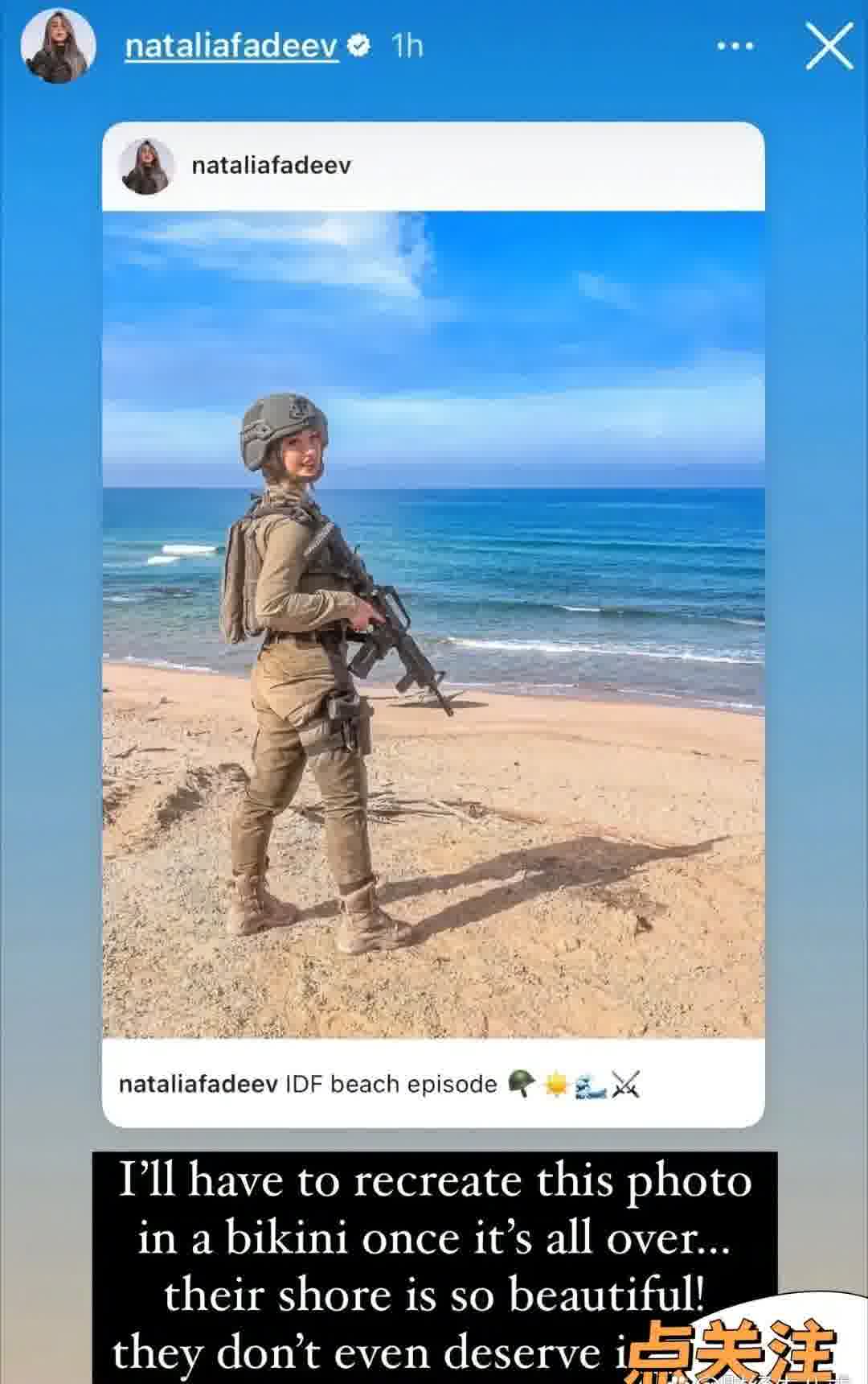 一名以色列女兵炫耀自己站在加沙海滩的照片,并配文说:“等一切结束后,我要穿着比基尼重拍这张照片,他们的海边真是太美了!他们不配拥有这么美的地方。”当年欧洲殖民者侵略北美大陆,日本鬼子侵略中国,估计很多人心里都是这么想的。