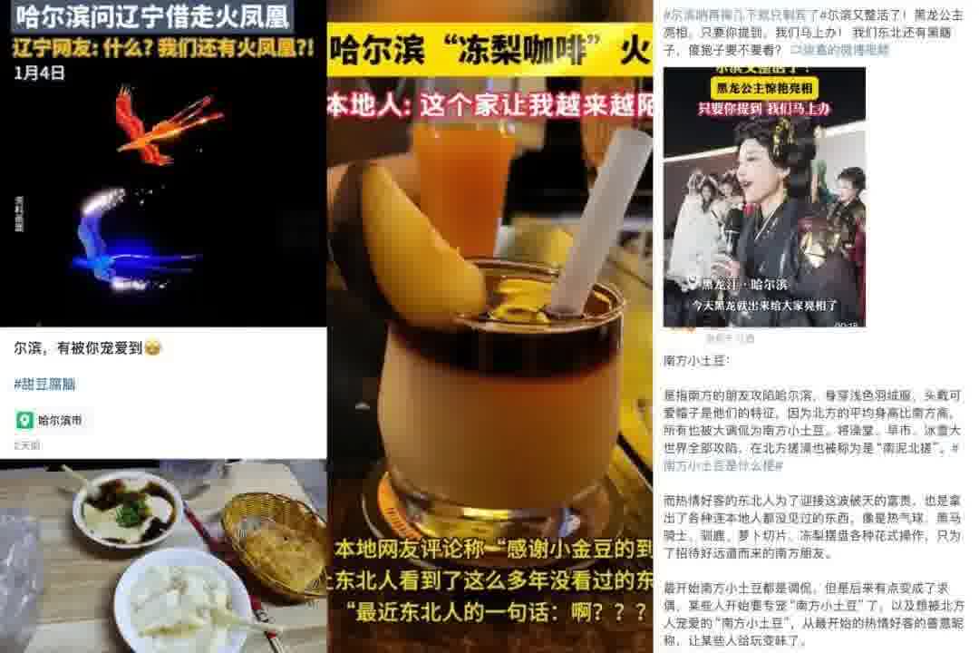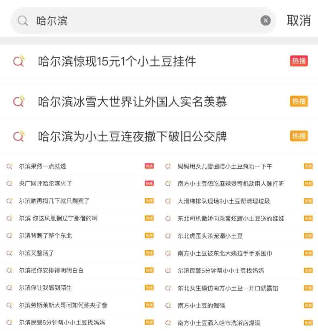 “哈尔滨惊现 15 元 1 个小土豆挂件”“南方小土豆是什么梗”“哈尔滨为小土豆连夜撤下破旧公交牌”“哈尔滨向沈阳借了两只凤凰”“尔滨果然一点就透”“尔滨你让我感到陌生”“三亚冬天败给了哈尔滨”“小砂糖橘”…… 每天都有无数个与哈尔滨相关的词条冲上微博热搜榜。