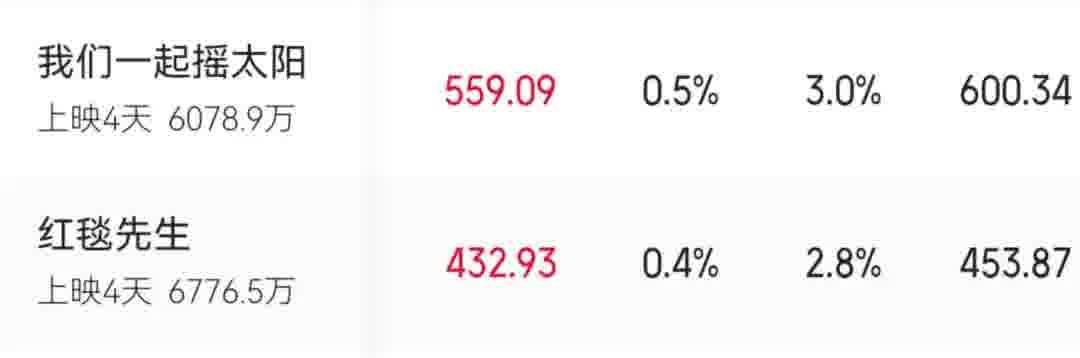 《红毯先生》票房不到 7000 万,排片降到 2.8%;《摇太阳》刚到 6000 万,排片量 3%;而且排片时段大多压着饭点儿和午夜,摇太阳成了摇月亮,预测过亿都费劲。