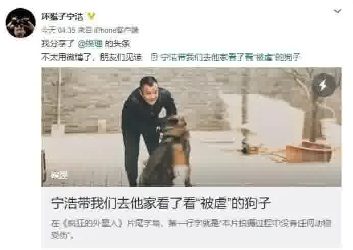 2019 年《疯狂的外星人》上映时,就有人喷宁浩虐狗,逼得他把狗子收养在院子里拍亲密视频澄清误会