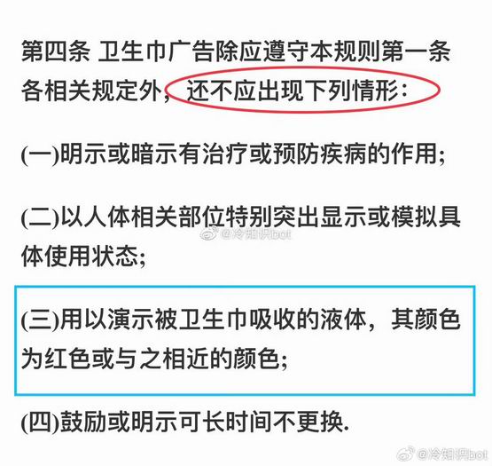 1. 卫生巾广告也是有条文规范约束的,根据《卫生巾广告自律规则》规定:“用以演示被卫生巾吸收的液体,其颜色不能为红色或与之相近的颜色”。主要是考虑到了在电视上的视觉展示效果。