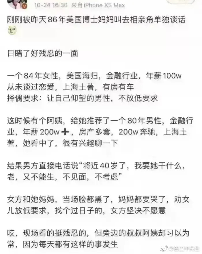 一个84年女性,美国海归,金融行业,年薪100w从未谈过恋爱,上海土著,有房有车。择偶要求:让自己仰望的男性,不放低要求!