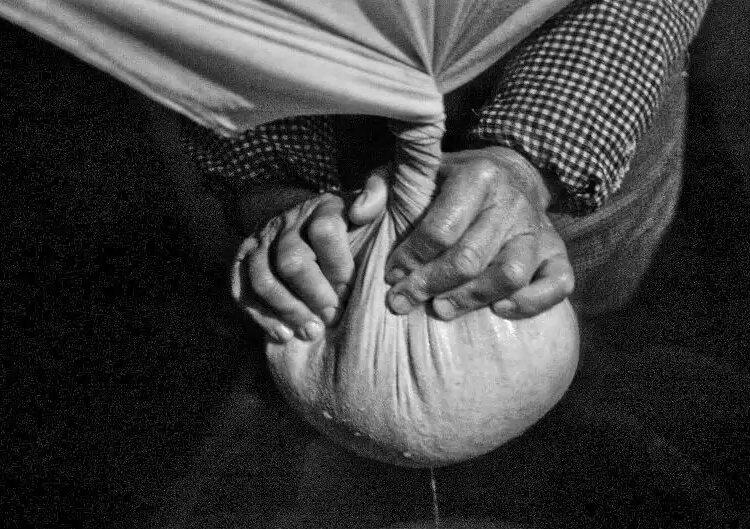 推完磨,我已经累得不能动了,下面是豆腐匠的活儿。两根木棍,平平地摆成十字形,用铁环穿着,吊在屋梁上。一匹四方的厚纱布,四角绑在两根木棍的四端,做成一个兜子。豆浆就倒在这兜子里。豆腐匠操纵着两根木棍,扭来扭去,白色的豆浆先是快,后是慢,流到下面的陶缸之中。最后留在兜里的就是豆渣。圆圆的,一整块。