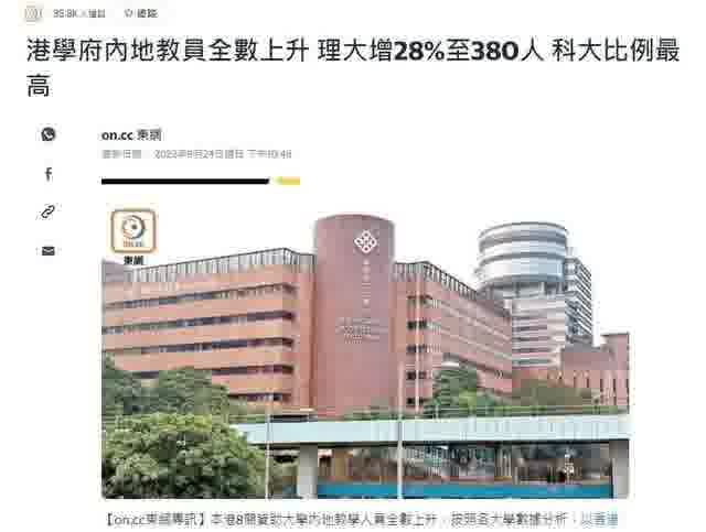 这几天我在香港媒体《明报》上看到一条新闻,《明报》记者在向香港大学教育资助委员会查询香港八大学府教师最新的籍贯资料时发现,在2022至2023学年,香港八所大学的大陆教师人数已经达到1815人,相较上一学年的1592人大幅增加了14%;而同期香港当地的老师人数则从1722人下降到了1670人,跌幅约为3%。