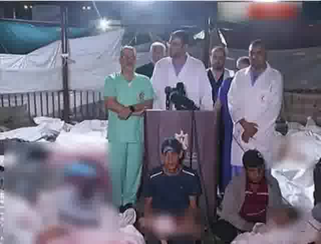 在阿赫利阿拉伯医院惨案发生之后,我在我们国内的社交媒体上看到了一组照片,准确来说是一组从卡塔尔半岛电视台的视频上截下来的截图。在左侧的截图中,阿赫利阿拉伯医院的医生在惨案发生之后出来发表公开声明,他们的周围摆满了用各种布料包裹起来的遇害者遗体,他们的演讲台前坐着两位疑似是父亲的男子,这两位男子的手上各抱着一个浑身血迹的婴儿。很显然,这两个孩子也死了。