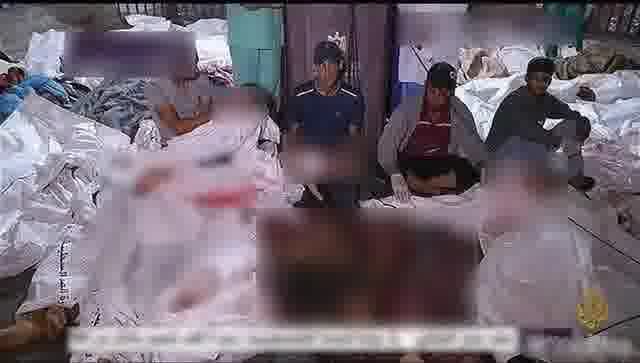 而右侧的截图则把左侧截图没有展示的那部分画面也给揭露出来了,透过这张截图,我可以清晰地在画面中看到,在盘坐在医生们脚下的那几名男子面前,密密麻麻地摆满了一地的婴儿遗体,他们有些人被裹上裹尸袋,有些则连裹尸袋都没有。斑斑的血痕和可怖的创口,几乎爬满了孩子全身上下的每一寸皮肤。