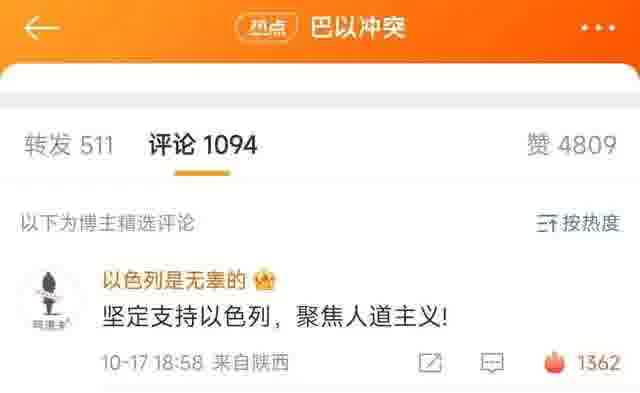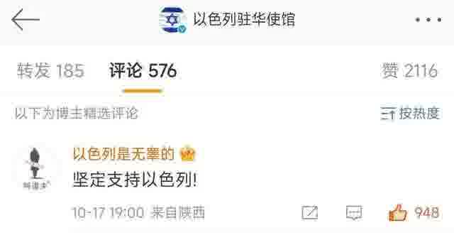 我估计负责运营以色列驻华大使馆官微的小编还挺美:“哟,我这原博一共也就4800个赞,让我给精选出来的评论居然都有1300赞了。这说明我们以色列在中国社媒上开展的舆论工作还是卓有成效的,支持以方在本轮巴以冲突的种种措施的中国民众还是大有人在的嘛!”