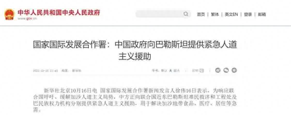 这两天我在网上看到一条暖新闻。据新华社消息,10月16日,中国国家国际发展合作署新闻发言人徐伟表示,为响应联合国呼吁、缓解加沙人道主义局势,中方正向联合国近东巴勒斯坦难民救济和工程处及巴民族权力机构分别提供紧急人道主义援助,用于解决加沙地带食品、医疗、居住等急需。