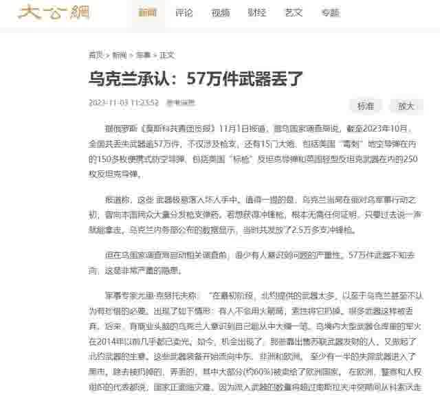 因为就在刷到那条短视频的几乎同一时间,我还在《参考消息》上看到了这样一则新闻:据俄媒《莫斯科共青团员报》援引乌克兰国家调查局的说法称,截至今年10月,乌克兰全国共丢失了各型武器装备逾57万件,其中包括各种枪支、大炮、包括美制“毒刺”和“标枪”在内的各型单兵导弹、其他配套弹药,甚至可能还有火箭和导弹。