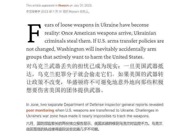 如果觉得俄媒报道的涉乌新闻不可信的话,那我们来看看美媒在相关话题上是怎么说的。今年7月末,美国《理性》(Reason)杂志曾经刊载过一篇文章,就北约援乌武器装备不翼而飞的相关问题表示了担忧。这篇文章指出,“西方在(北约)援乌武器一事上的担忧已经成了现实:只要美国援助武器一运抵,乌克兰的犯罪分子就会将它们偷走。要是美国还抱着如今这套军援正常的观念固守不改,那么或早或晚,华盛顿一定会被自己扔出去的回旋镖打脸。