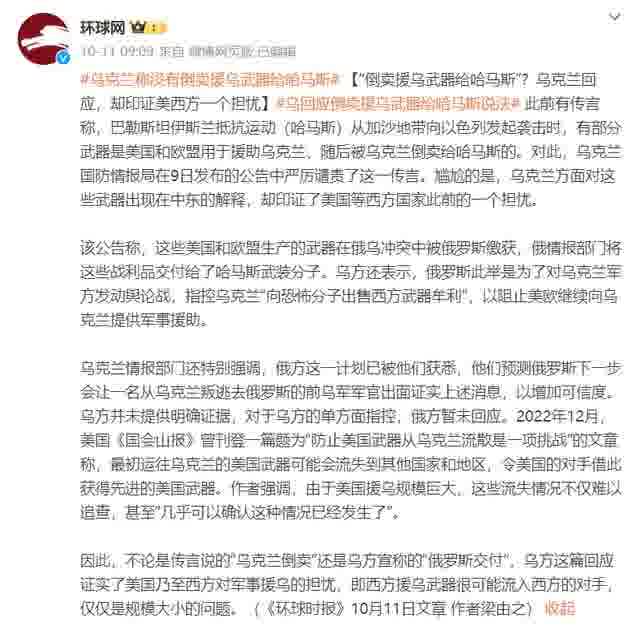 西方宣传机器和哈马斯就“乌克兰疑向哈马斯倒卖北约军援”这事隔空斗法其实不算什么新闻。早在本轮巴以冲突爆发之初,国内外的舆论场上其实就已经冒出过相关传闻了,而且那会儿乌克兰情报部门还特意出来进行过公开“辟谣”。他们明确驳斥了相关传闻,并对“造谣传谣者”提出了强烈谴责,还反手把屎盆子给扣到了俄罗斯的头上,宣称这些“谣言”都是俄罗斯的宣传机构炮制出来的,其目的就是为了对乌军发动舆论战,指控乌克兰向哈马斯出售西方武器牟利,以阻止北约继续为乌提供军援。