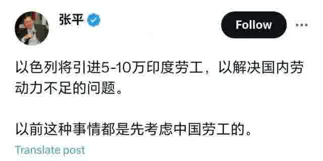 我真是被在以色列特拉维夫大学当终身教授的张平给逗乐了。这两天我在张平的推特(现在叫X)上看到他用简体中文,满怀怨气地发了一条短内容:“以色列将引进5-10万印度劳工,以解决国内劳动力不足的问题。以前这种事情都是先考虑中国劳工的。”
