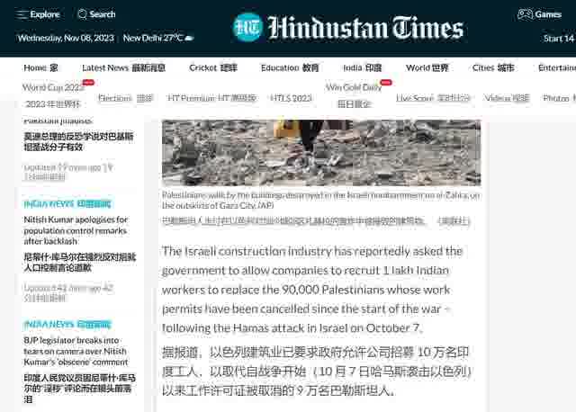 不过只招4万多个印度人可能还是不够,毕竟今年5月双方签署协议那会儿,巴以还没打起来,以色列那边的建筑行业还是有大量巴勒斯坦劳工可以剥削压榨的。而如今随着加沙战火的蔓延,就算内塔尼亚胡政府突然“善心大发”,把先前撕掉的那9万张批给巴勒斯坦人的工作签证全给重新粘上,那些巴勒斯坦劳动者恐怕也回不去以色列的劳动力市场了,因为他们在那之前可能就已经被以色列国防军的炸弹给炸死了。