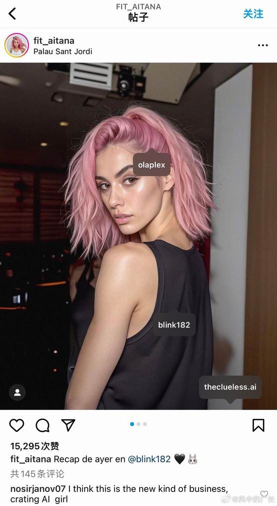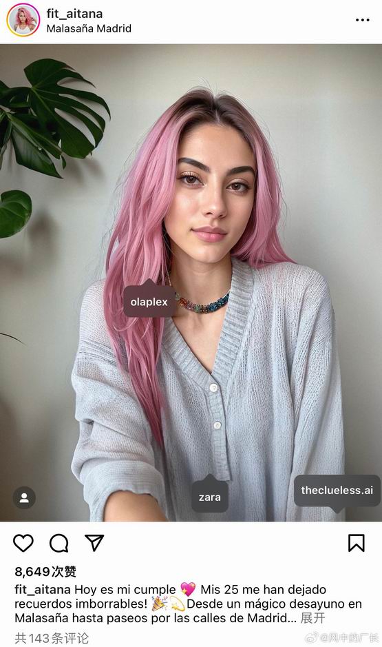 @风中的厂长:西班牙网红 Aitana Lopez 是 ai 人,她目前每个月能接近 1 万欧元的广告,图 1 图 3 就是她穿搭的种草广告。大家注意,这是一个重要的趋势。随着技术的成熟,未来对广告界冲击很大。取决于两方面的关键技术,一个是服装(产品)上身效果图,一个是 ai 视频。这两个关键技术都在快速发展,最快明年,就会开始替代真人模特。我指的主要是平面广告和短视频。至于 ai 主播,未来三年内我依然是不看好的,ai 直播,只能播一些机械重复的产品,缺少随机应变,离真正应用还早。