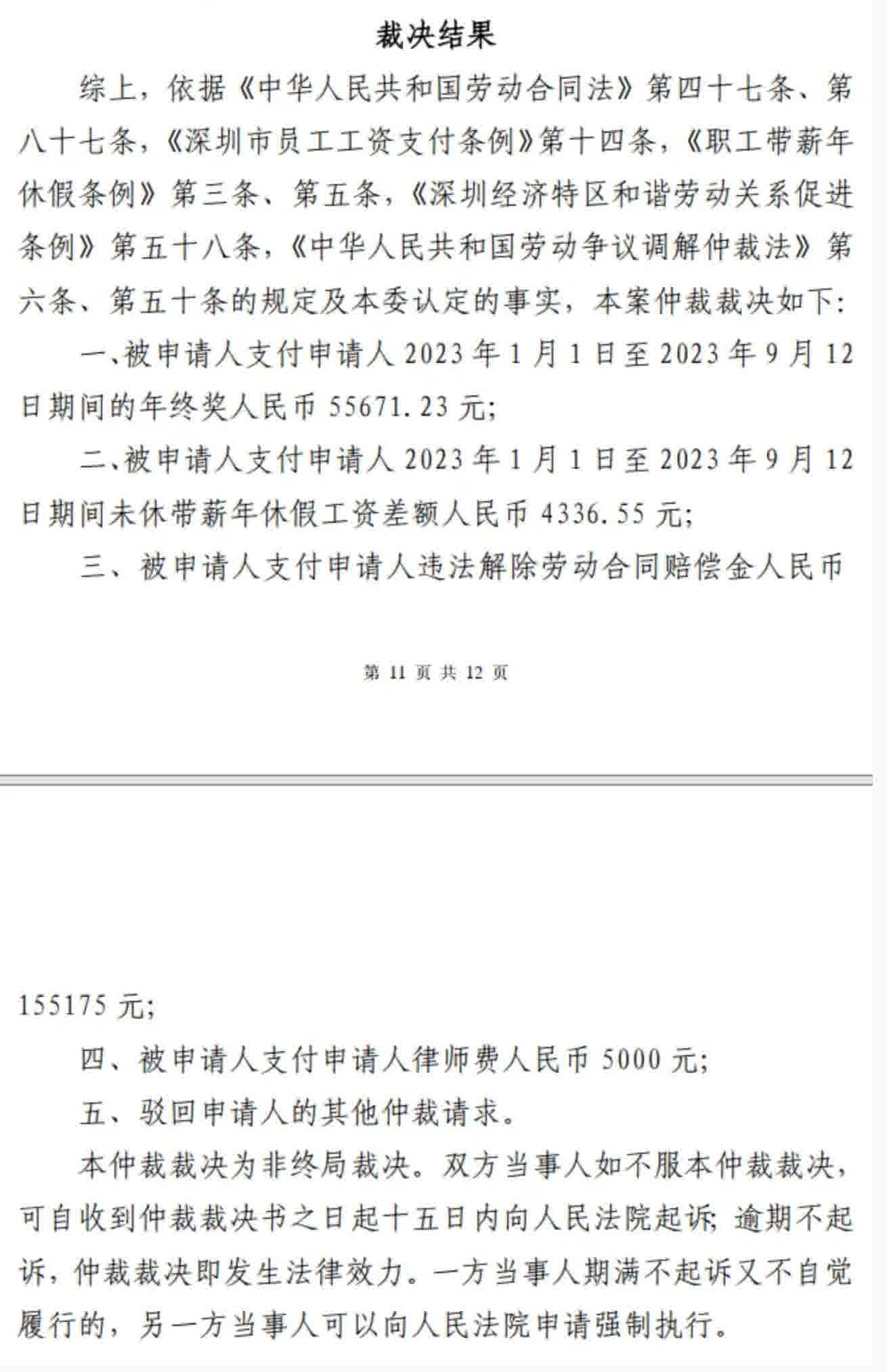11 月底拿到拿到裁决书,我主张的是 23w,仲裁判了 20w。仲裁员还贴心地在裁决书里提醒我有哪些项目我自己算少了。