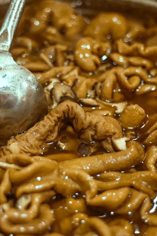 随后用辣椒、酱油、葱油、黄酒、高汤调成的卤汁,把肥肠煨软。经过长时间烹煮,肌纤维断裂,除了脂香和嚼劲之外,蛋白质还能分解成带有鲜味的氨基酸,为肥肠的美味增光添彩。