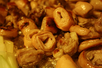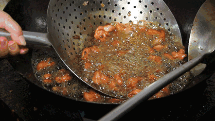 在《礼记》周天子食谱中,记载了用猪网油包裹肝泥油炸的食物 “肝膋”。网油的作用给碎散的食材定型,保存其原汁原味。在炸制的过程中,油脂自然融化,渗入食材内部,上桌后自然带着浓郁的肥肠脂香。