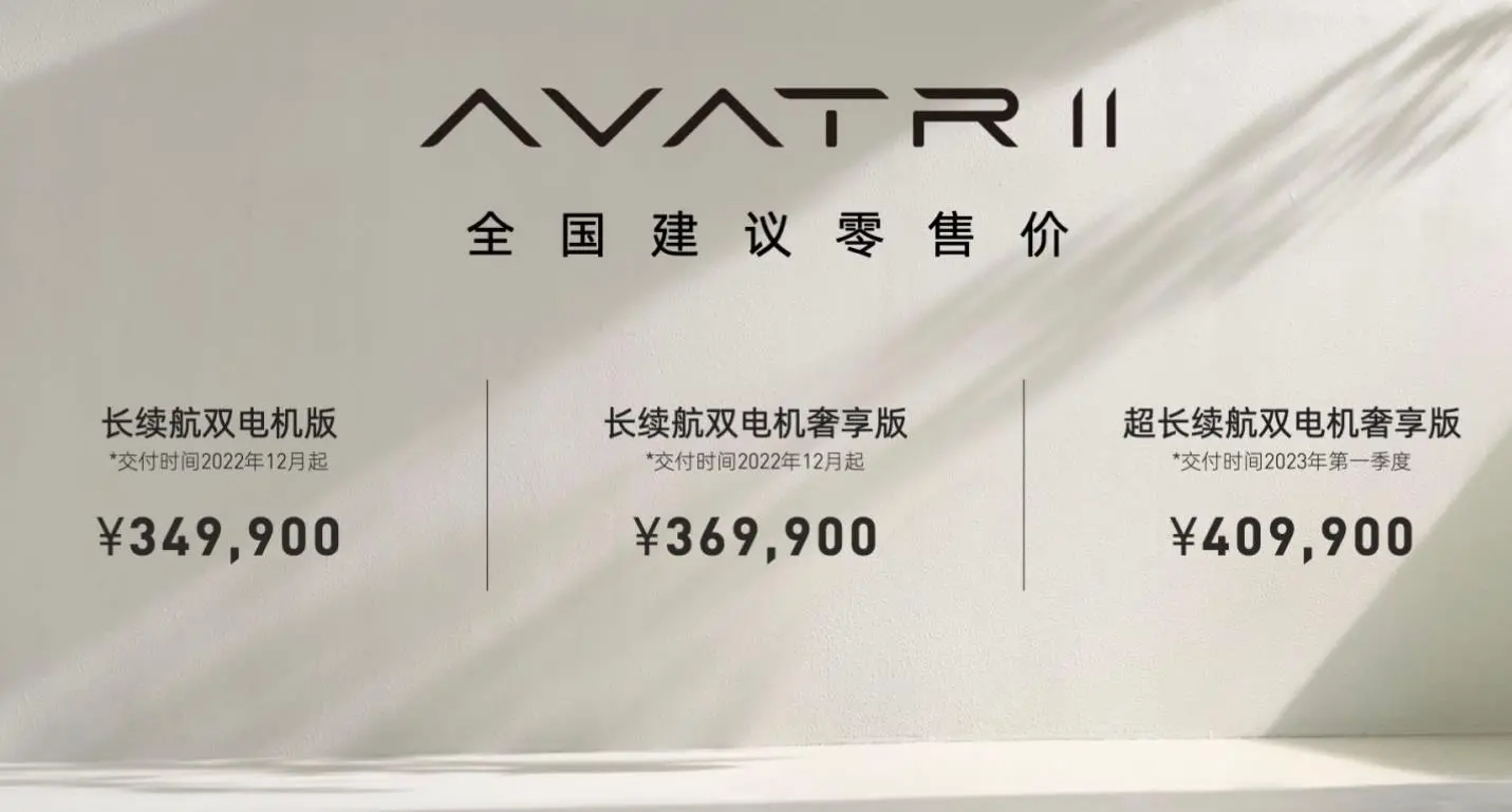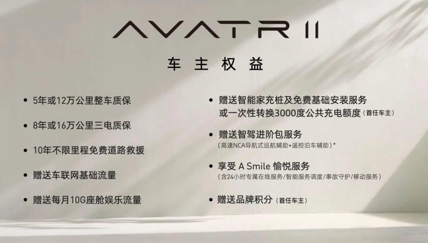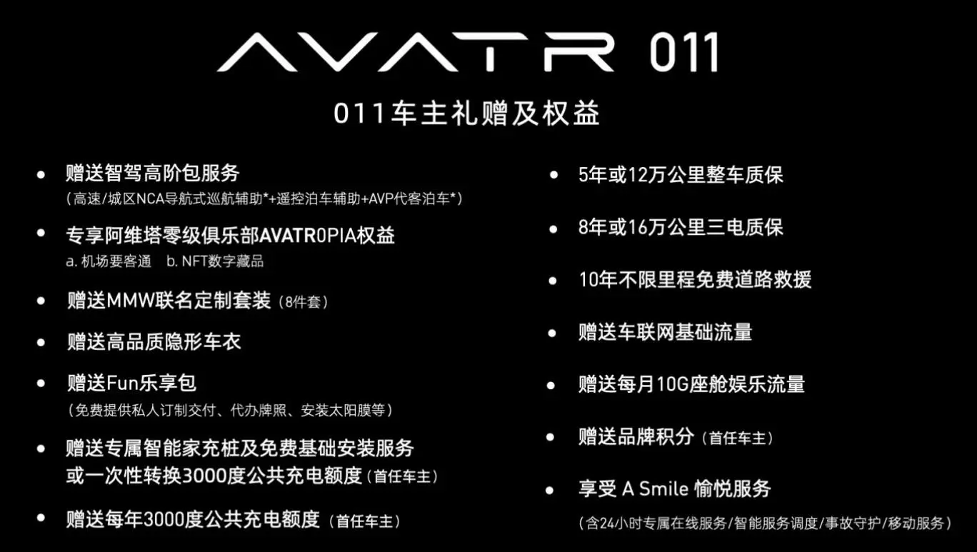 8月8日,阿维塔11车型上市,新车共推出了3款车型,售价区间为34.99-40.99万元,首批车型将于12月开启交付,同时新车还推出了一款限量500台的阿维塔011限量版,售价60万元。此外,官方还为消费者提供了诸多购车福利,包括:5年或12万公里整车质保,8年或16万公里三电质保,10年不限里程免费道路救援,首任车主赠送智驾进阶包服务,赠送车联网基础流量及每月10G座舱娱乐流量等。