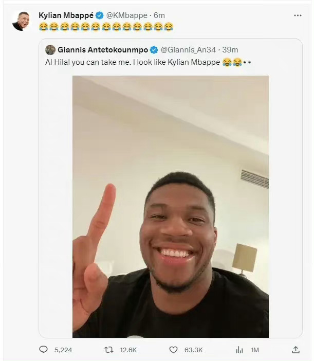 不过这条交易流言还是触动着其他人,NBA 巨星字母哥都眼馋这 7 亿欧元 —— 他在社交媒体上调侃:“利雅得新月,你可以签我。我长得有点像姆巴佩。”