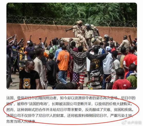 “法国不仅抢走了原本属于尼日尔人的财富,还把用过之后的核废料重新运回尼日尔,污染当地的土地,导致尼日尔部分地区的人们疾病缠身”