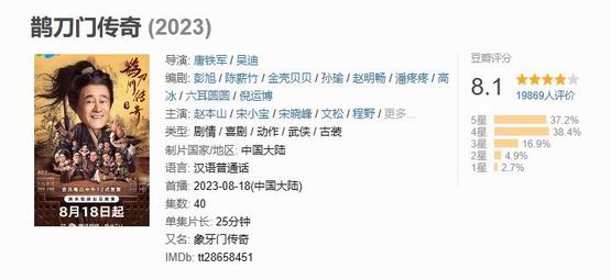 在微博上,《鹊刀门传奇》的搜索热度一度超过了今年暑期大热的古偶剧《长相思》;在豆瓣上,《鹊刀门传奇》从开分的.7.9.现在已经涨到了.8.1。