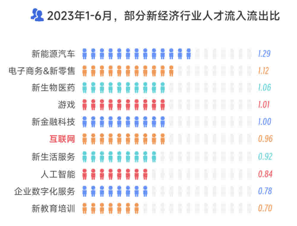 脉脉高聘人才智库发布的《2023 泛互联网行业人才流动报告》显示,近 3 年,万人以上规模大厂人才流入流出比持续走低,从高速扩张转为局部收缩。2023 年上半年,互联网行业出现明显的人才溢出现象,有超过一半的跳槽者(52.31%)进入其他行业。其中,新能源汽车行业成为热点,人才流入流出比高达 1.29。