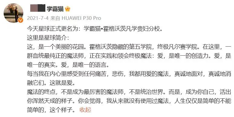 2021 年 7 月,“学霸猫” 把社群改名为 “学霸猫・霍格沃茨凡学贵妇分校”。她的教学理念就是:清理对金钱的恐惧,大笔金钱流动才能打开自己的能量。